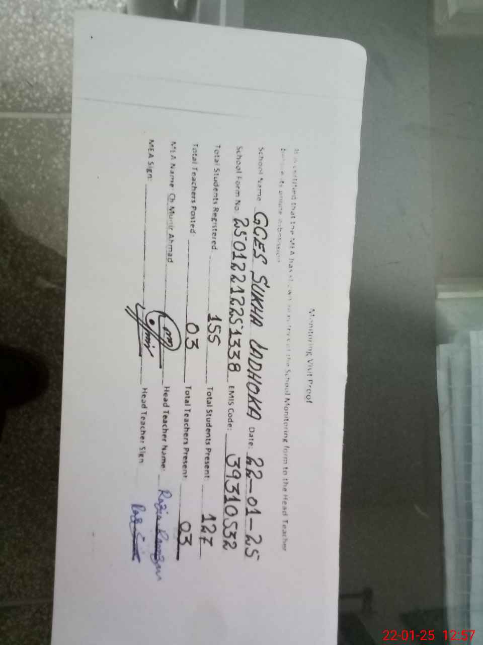 | Attendance Register | Head Teacher | MEA with School | Visit Proof |