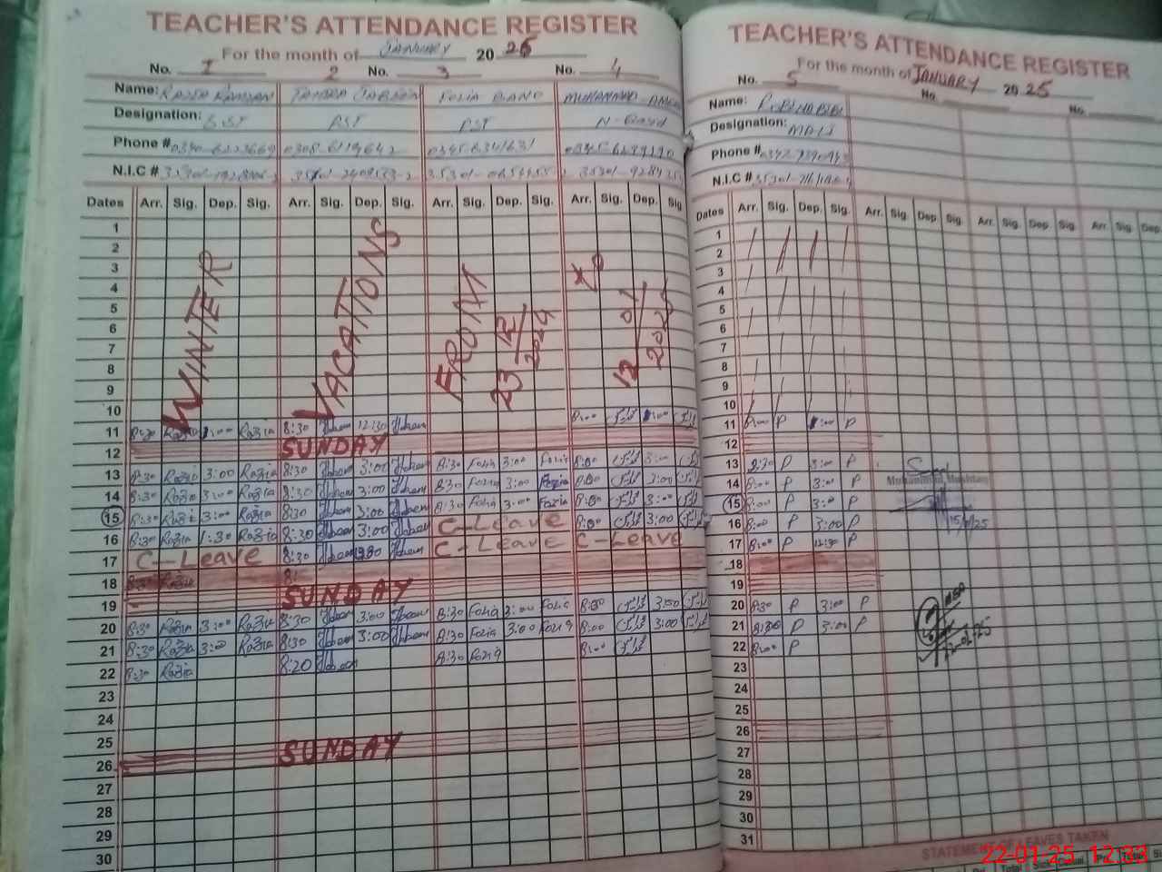| CNIC | Full Name | Designation | R/C | Absence During Last Calender Month |