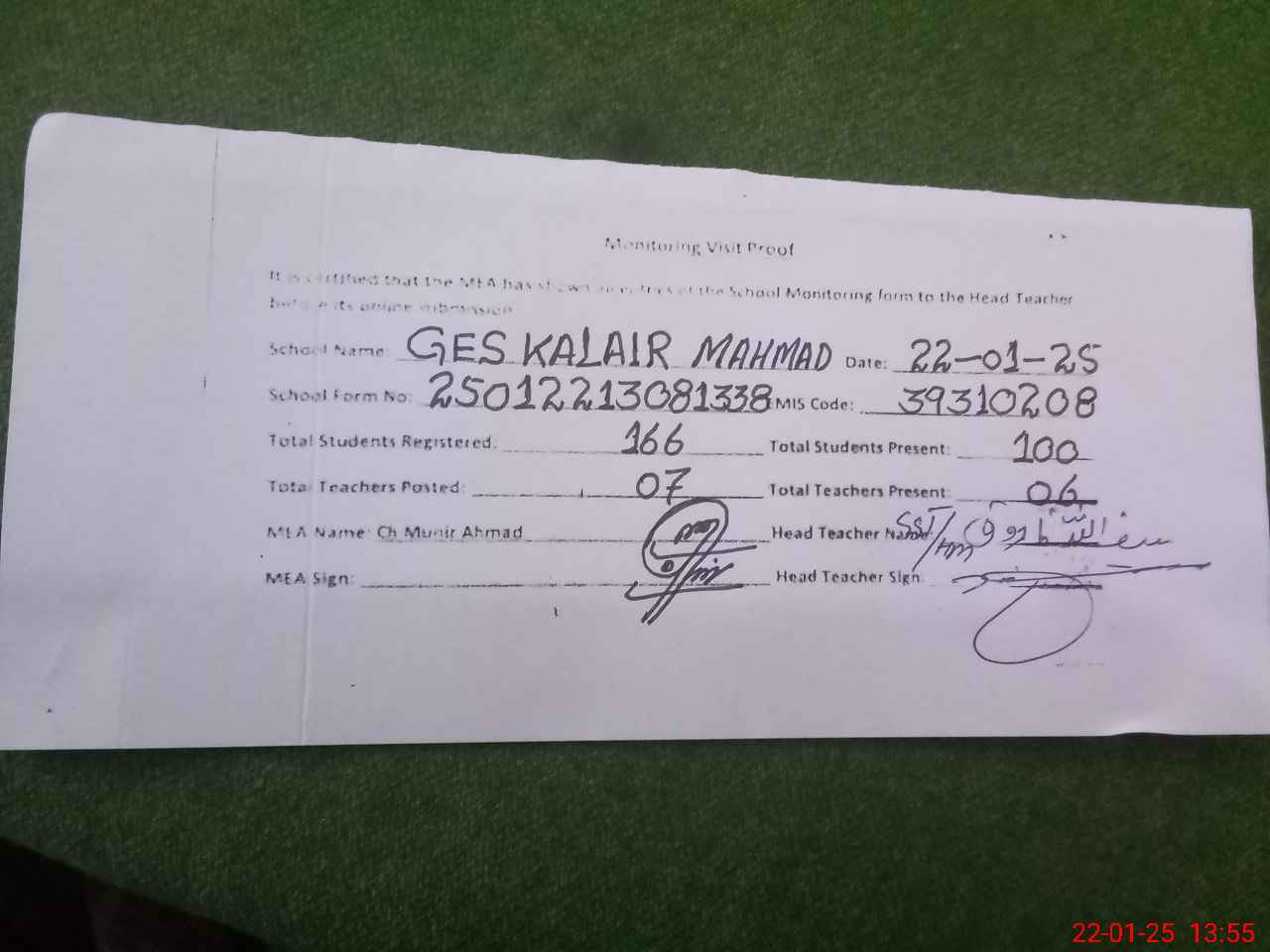 | Attendance Register | Head Teacher | MEA with School | Visit Proof |