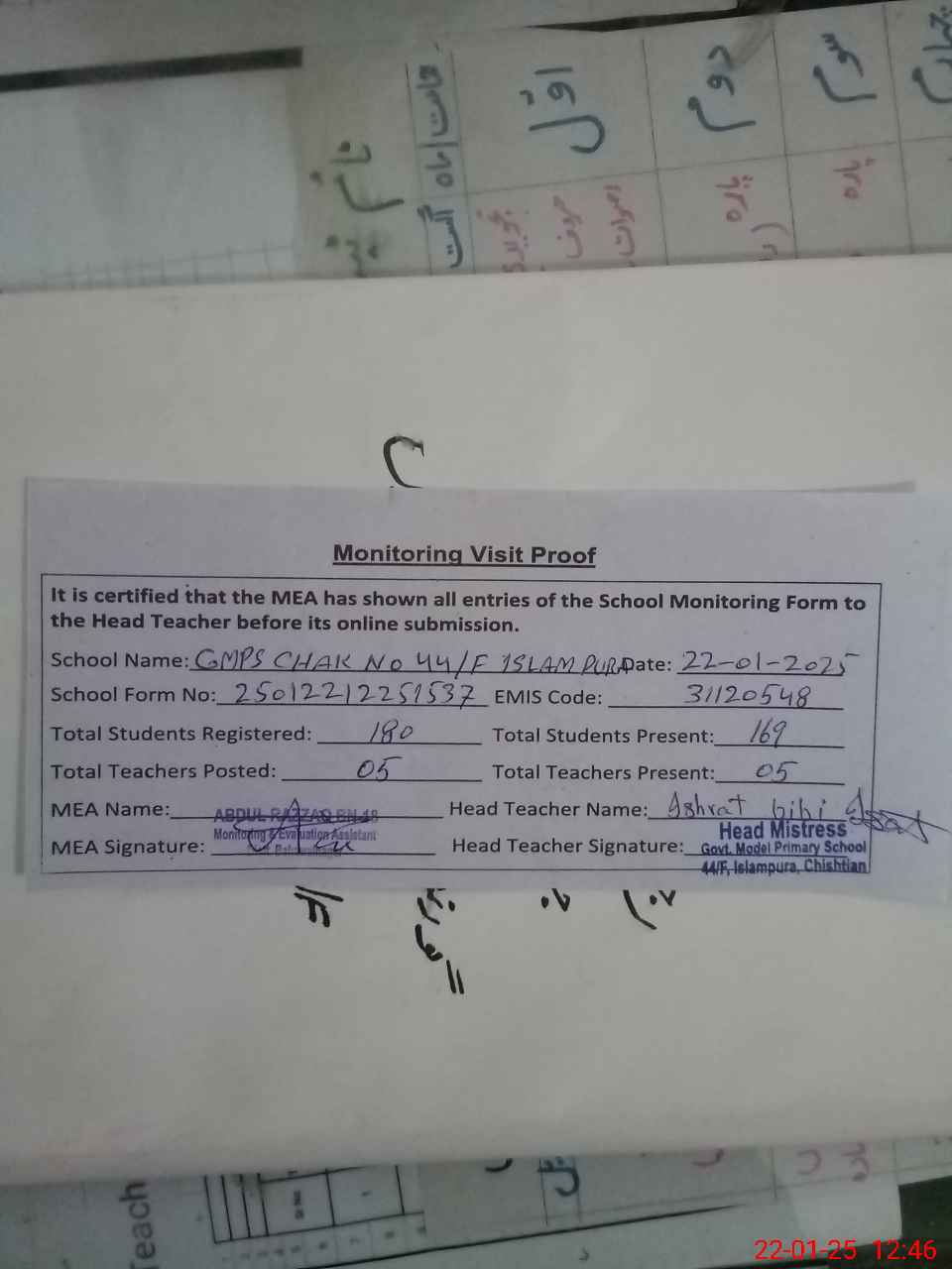 | Attendance Register | Head Teacher | MEA with School | Visit Proof |