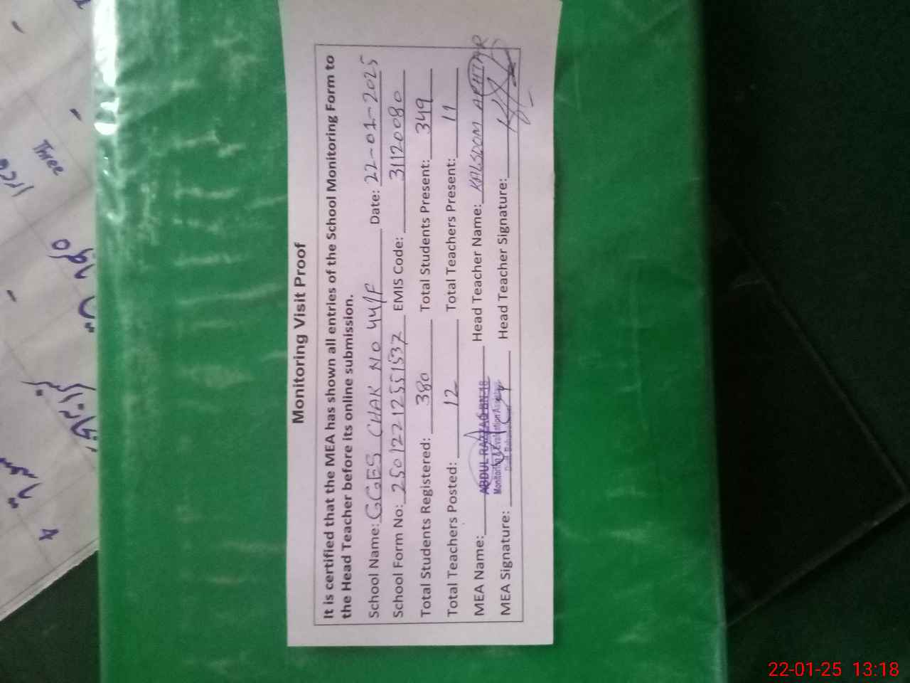 | Attendance Register | Head Teacher | MEA with School | Visit Proof |
