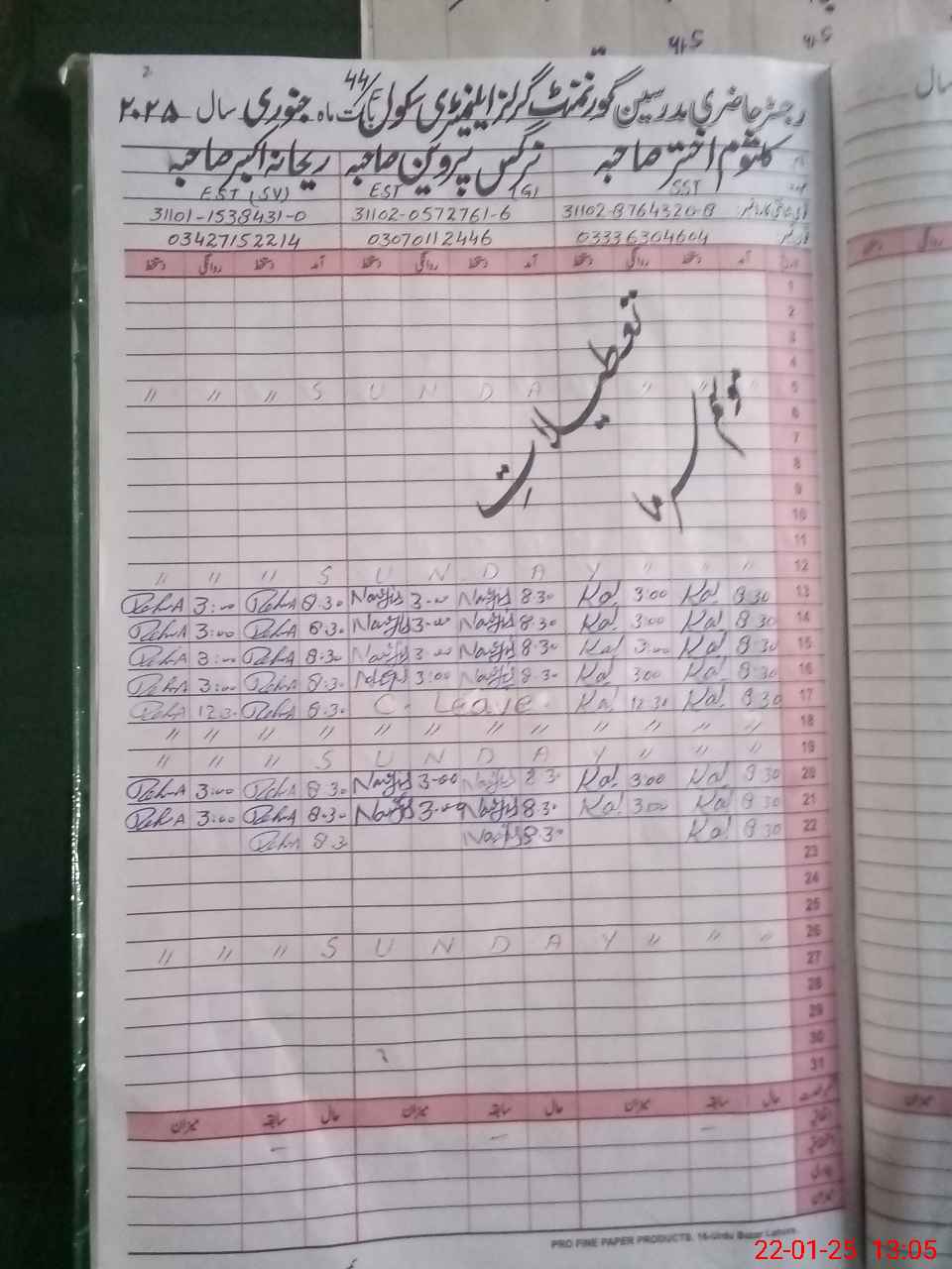| CNIC | Full Name | Designation | R/C | Absence During Last Calender Month |