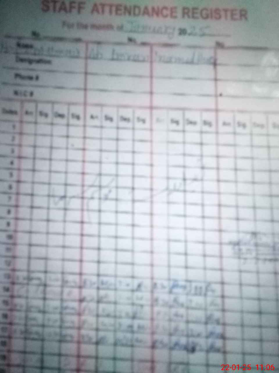 | CNIC | Full Name | Designation | R/C | Absence during last cal. month |
