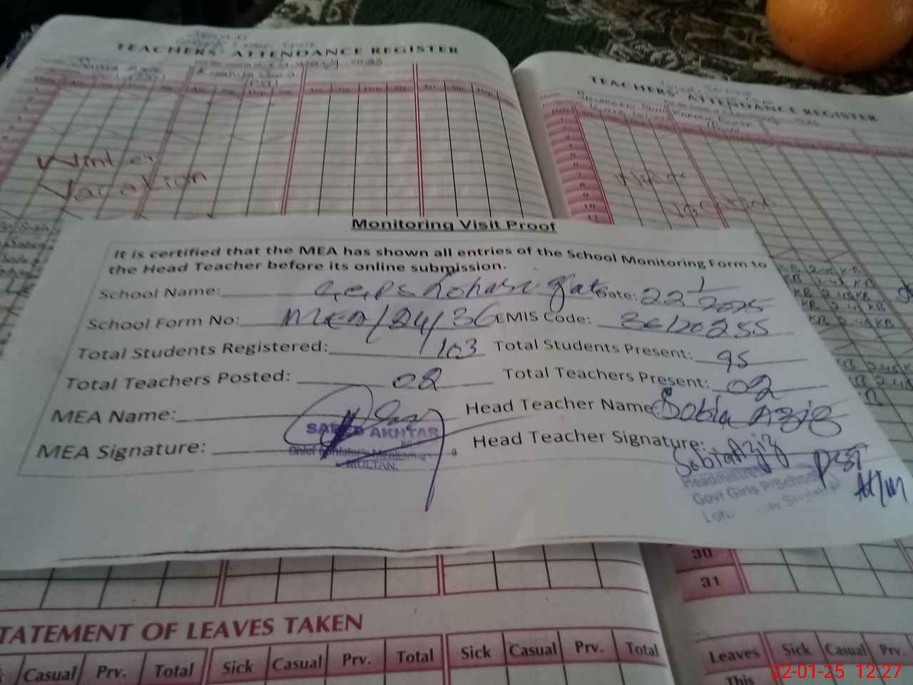 | Attendance Register | Head Teacher | MEA with School | Visit Proof |