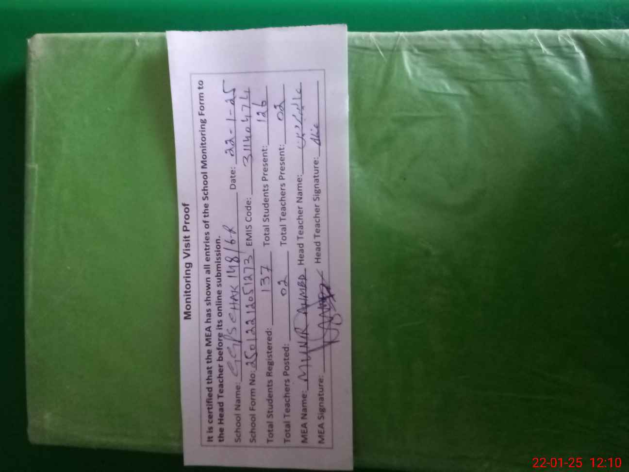 | Attendance Register | Head Teacher | MEA with School | Visit Proof |