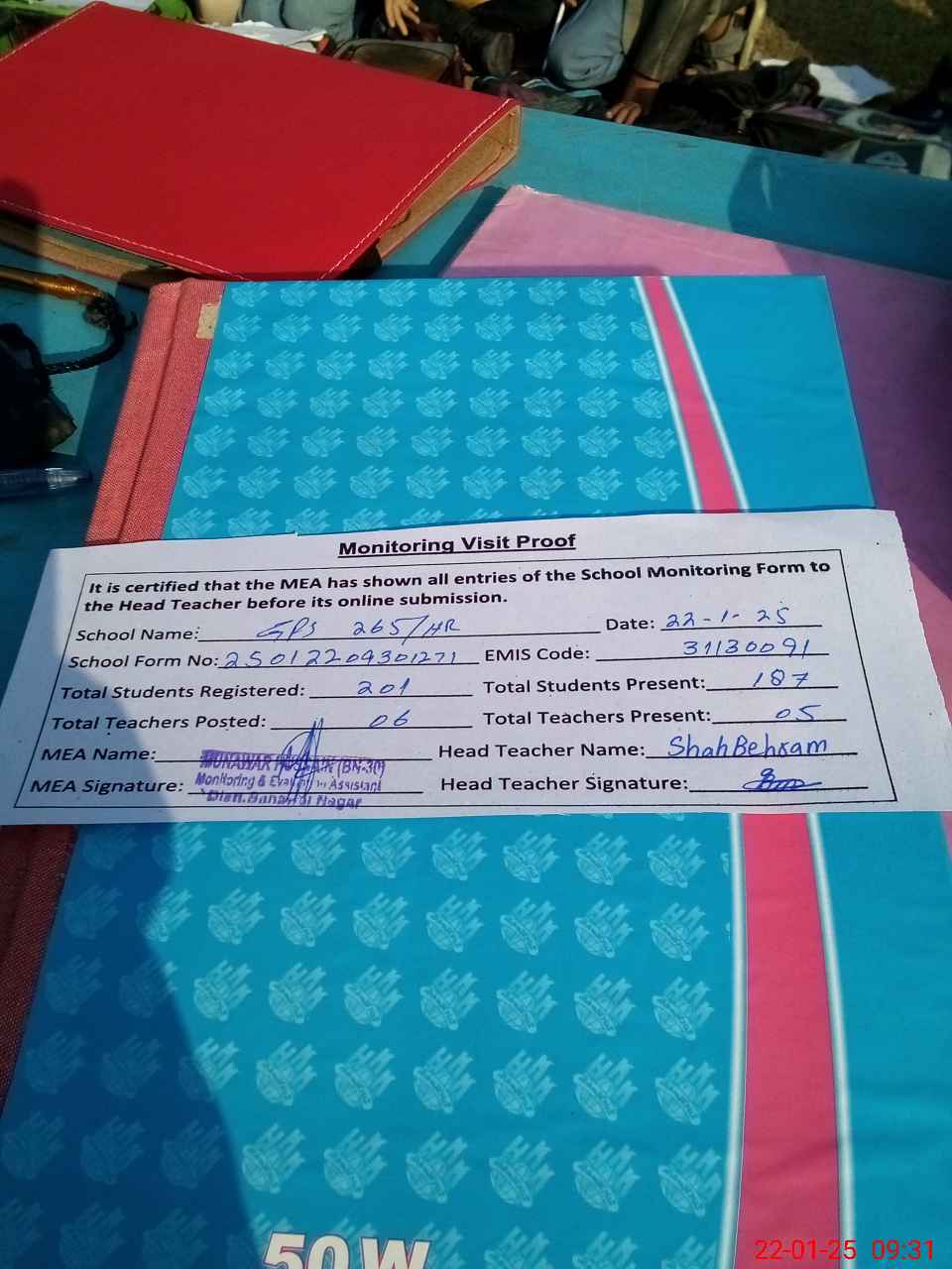 | Attendance Register | Head Teacher | MEA with School | Visit Proof |