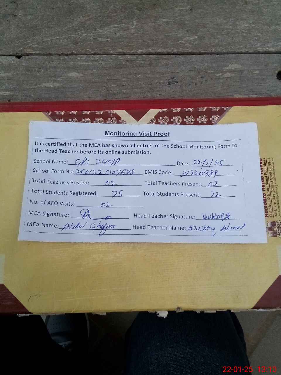 | Attendance Register | Head Teacher | MEA with School | Visit Proof |