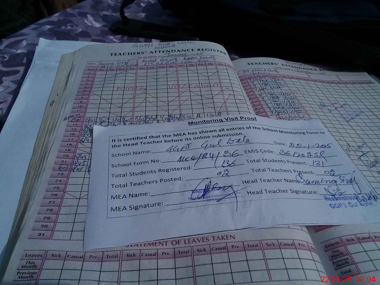 | Attendance Register | Head Teacher | MEA with School | Visit Proof |