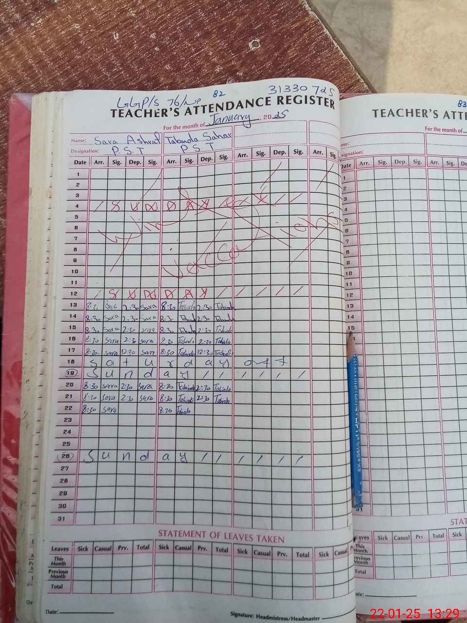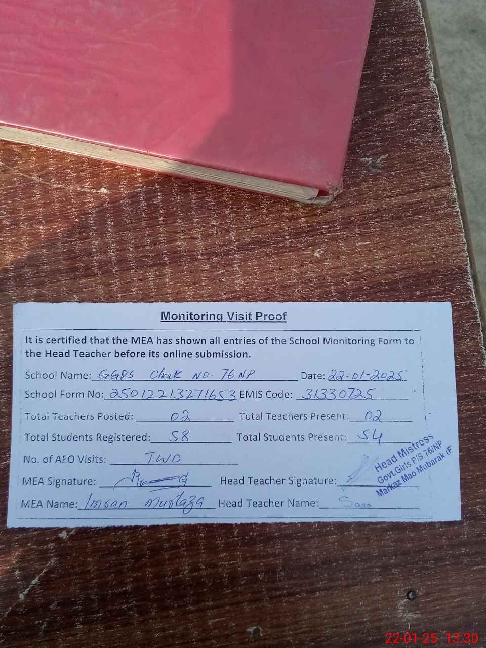 | Attendance Register | Head Teacher | MEA with School | Visit Proof |