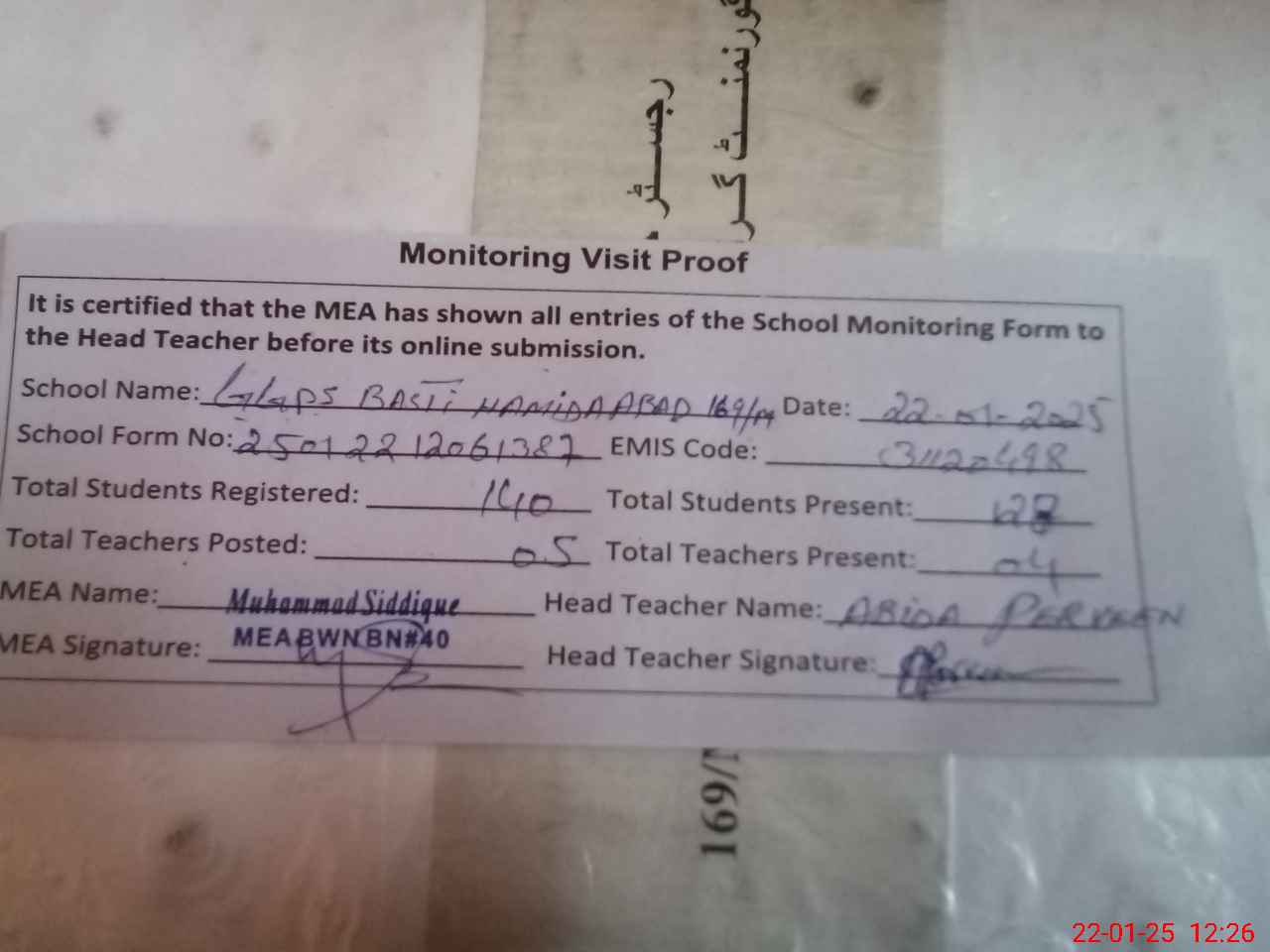 | EMIS Code: 31120498 | Name of School: GGPS BASTI HAMIDA ABAD 169/M HB | |||