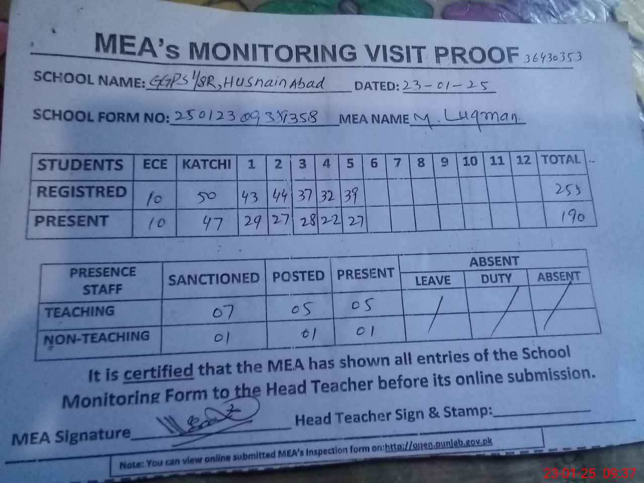 | Attendance Register | Head Teacher | MEA with School | Visit Proof |