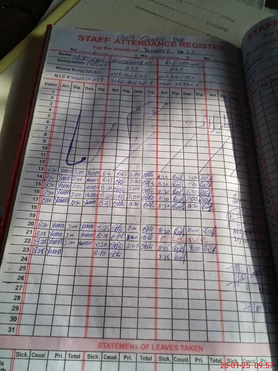 | CNIC | Full Name | Designation | R/C | Absence during last cal. month |