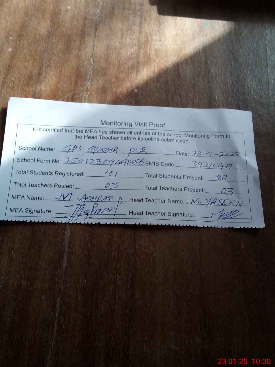 | Attendance Register | Head Teacher | MEA with School | Visit Proof |