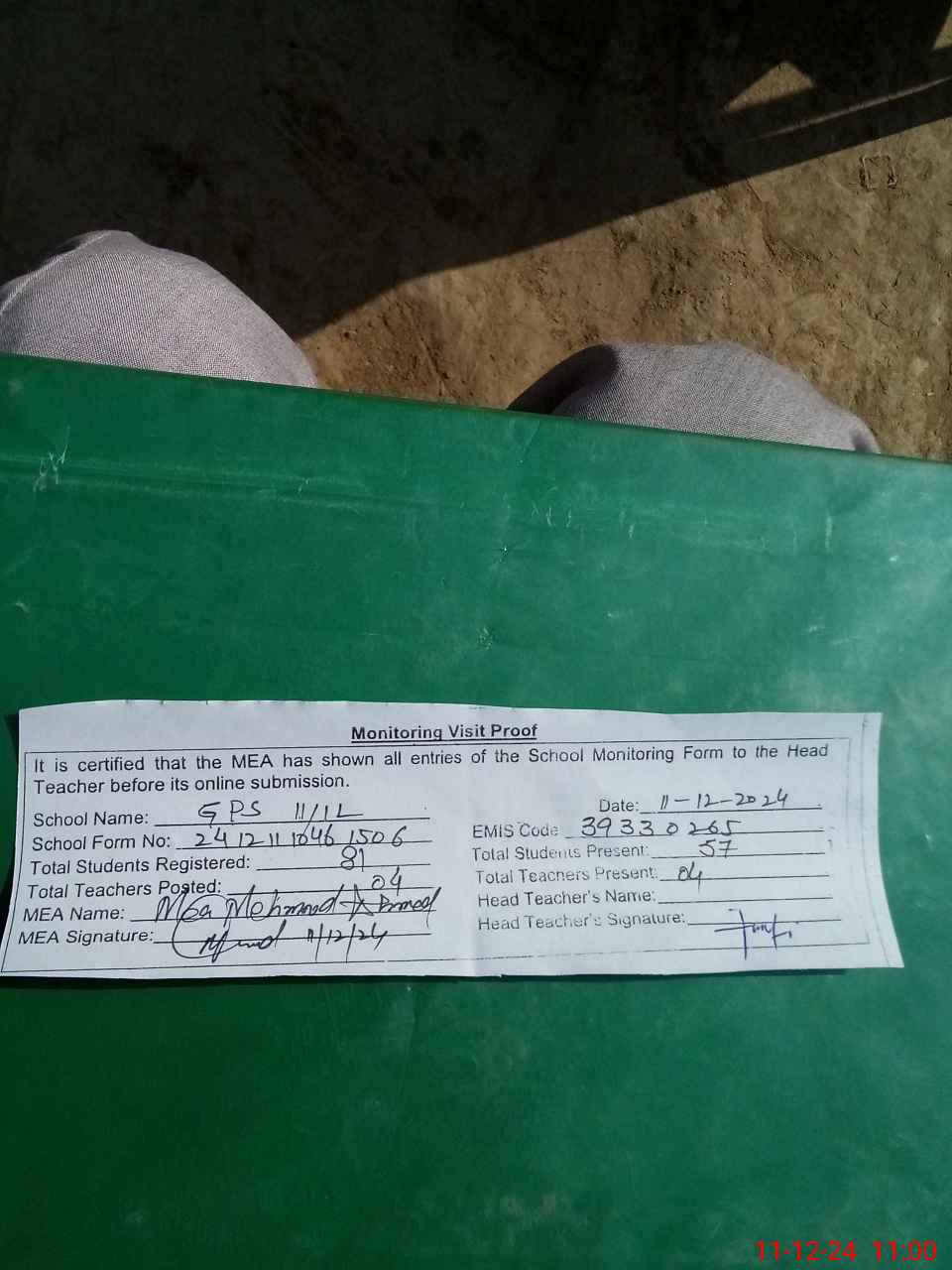 | Attendance Register | Head Teacher | MEA with School | Visit Proof |