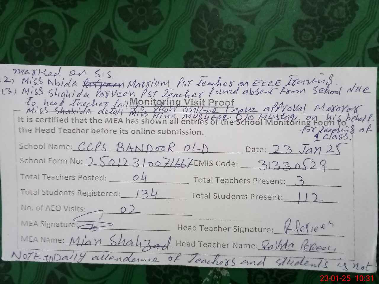 | Remarks (Use Separate Page if Required): 1 Daily attendance of teachers and students is not marked on SIS 2 Miss Abida Marrium PST teacher on ECCE training 3 Miss Shahida Parveen PST teacher found absent from school during visit due to head teacher fail to show online leave approval moreover Miss Shahida Parveen details miss Hina Mushtaq D O Mushtaq Abdullah on his behalf for teaching of one class | |||||