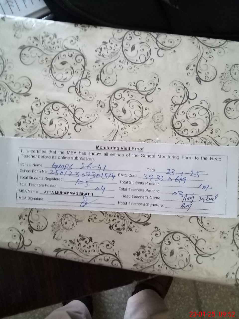 | Attendance Register | Head Teacher | MEA with School | Visit Proof |