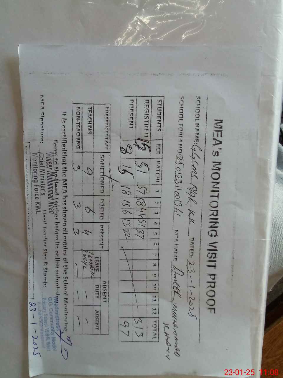 | Attendance Register | Head Teacher | MEA with School | Visit Proof |