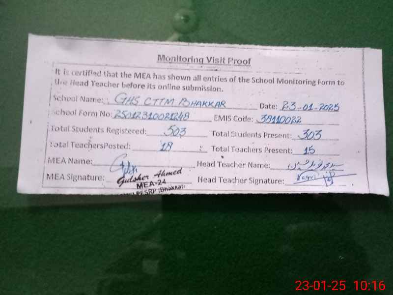 | EMIS Code: 38110022 | Name of School: GHS CTTM BHAKKAR MANDI TOWN | |||