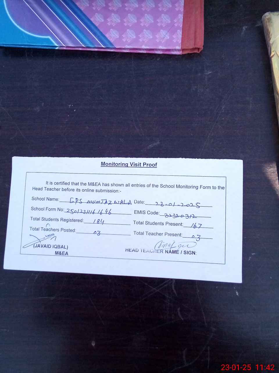 | EMIS Code: 32320312 | Name of School: GPS MUMTAZ WALA | |||