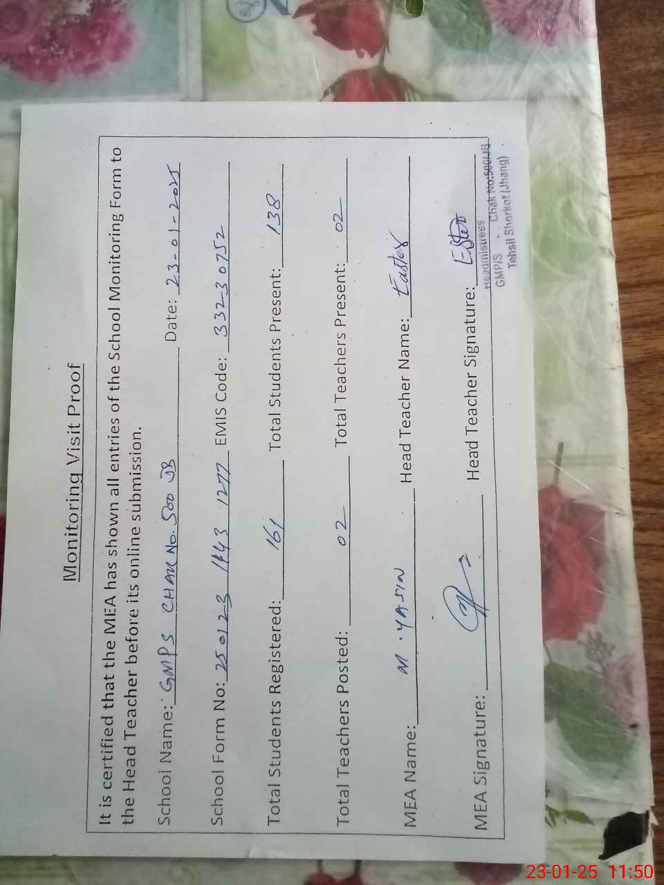 | Attendance Register | Head Teacher | MEA with School | Visit Proof |