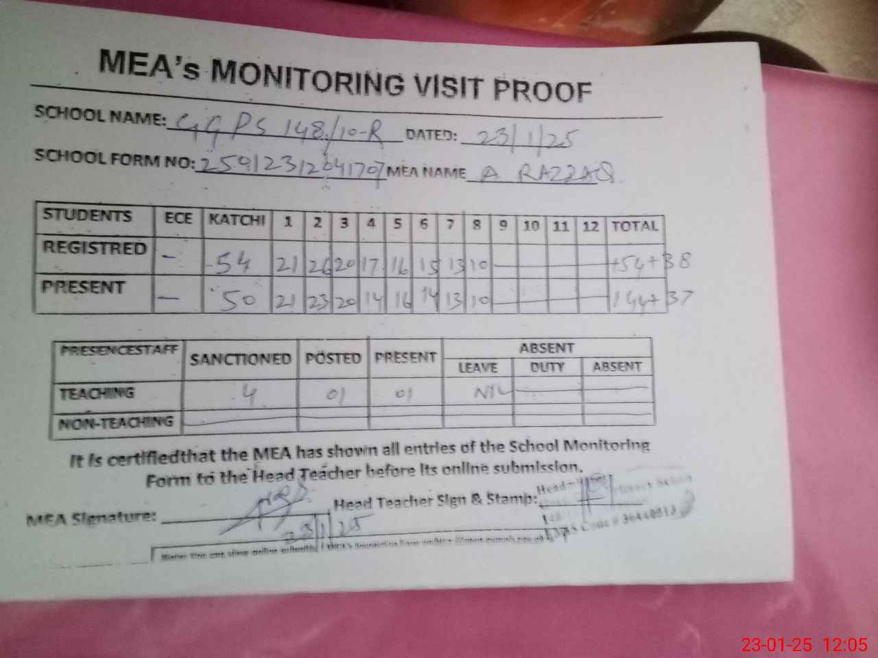 | Attendance Register | Head Teacher | MEA with School | Visit Proof |