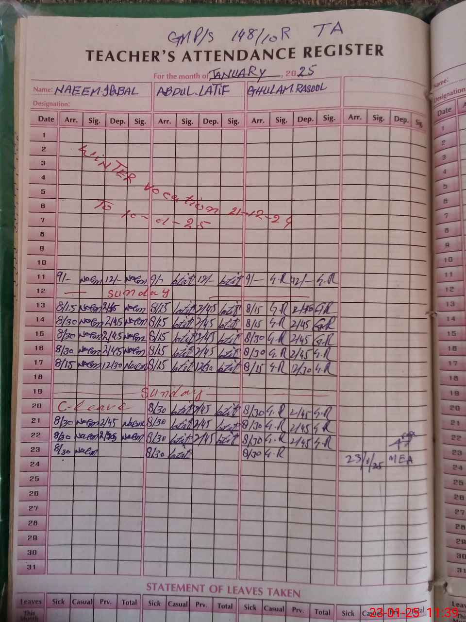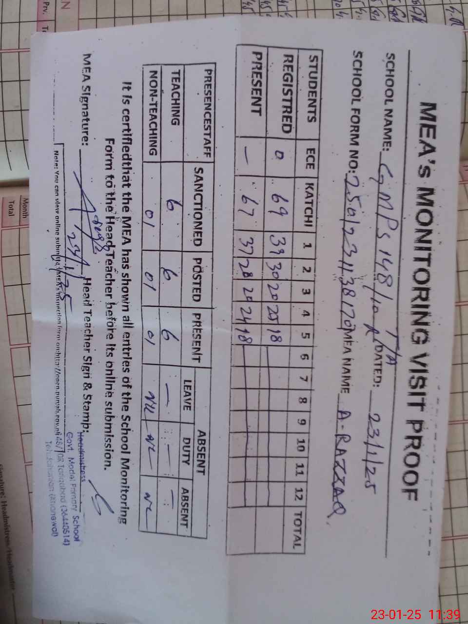| Attendance Register | Head Teacher | MEA with School | Visit Proof |
