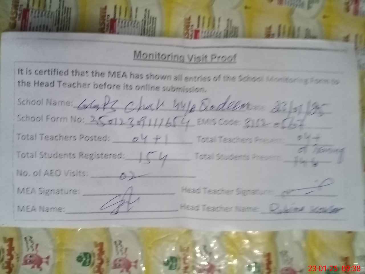 | Attendance Register | Head Teacher | MEA with School | Visit Proof |