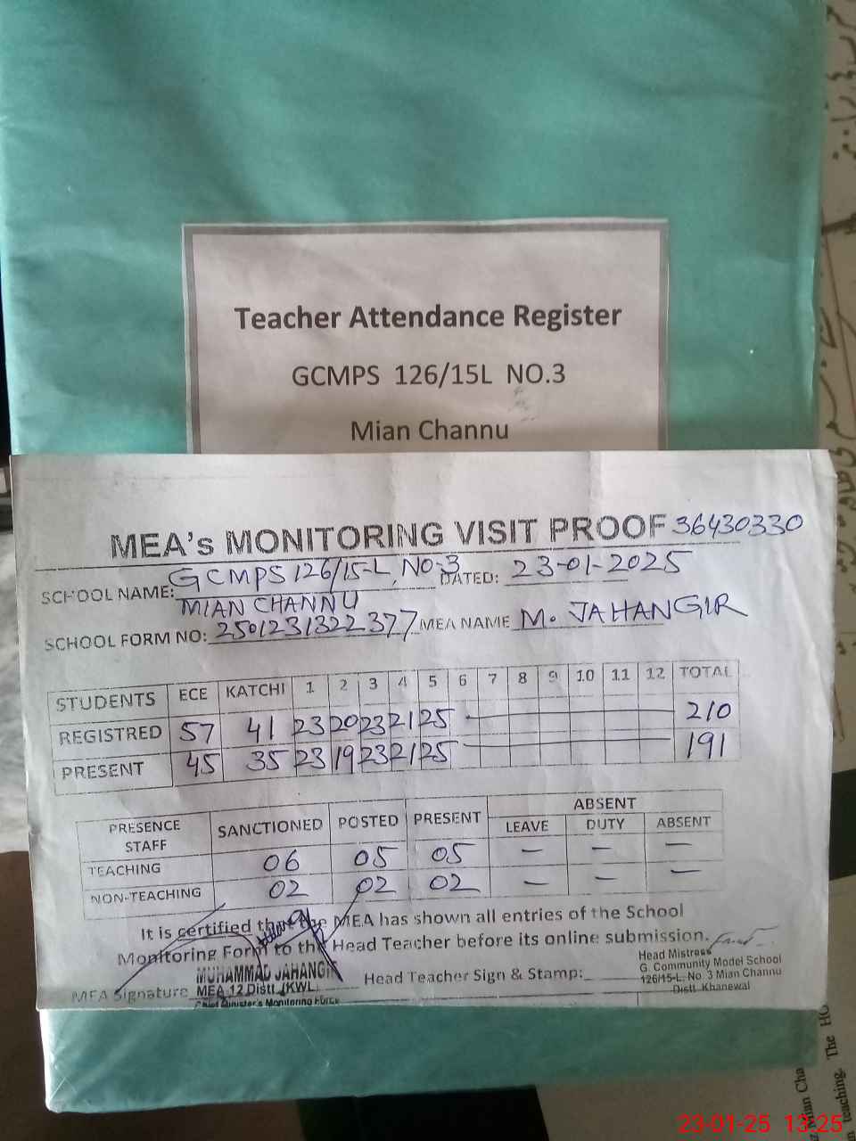 | Attendance Register | Head Teacher | MEA with School | Visit Proof |