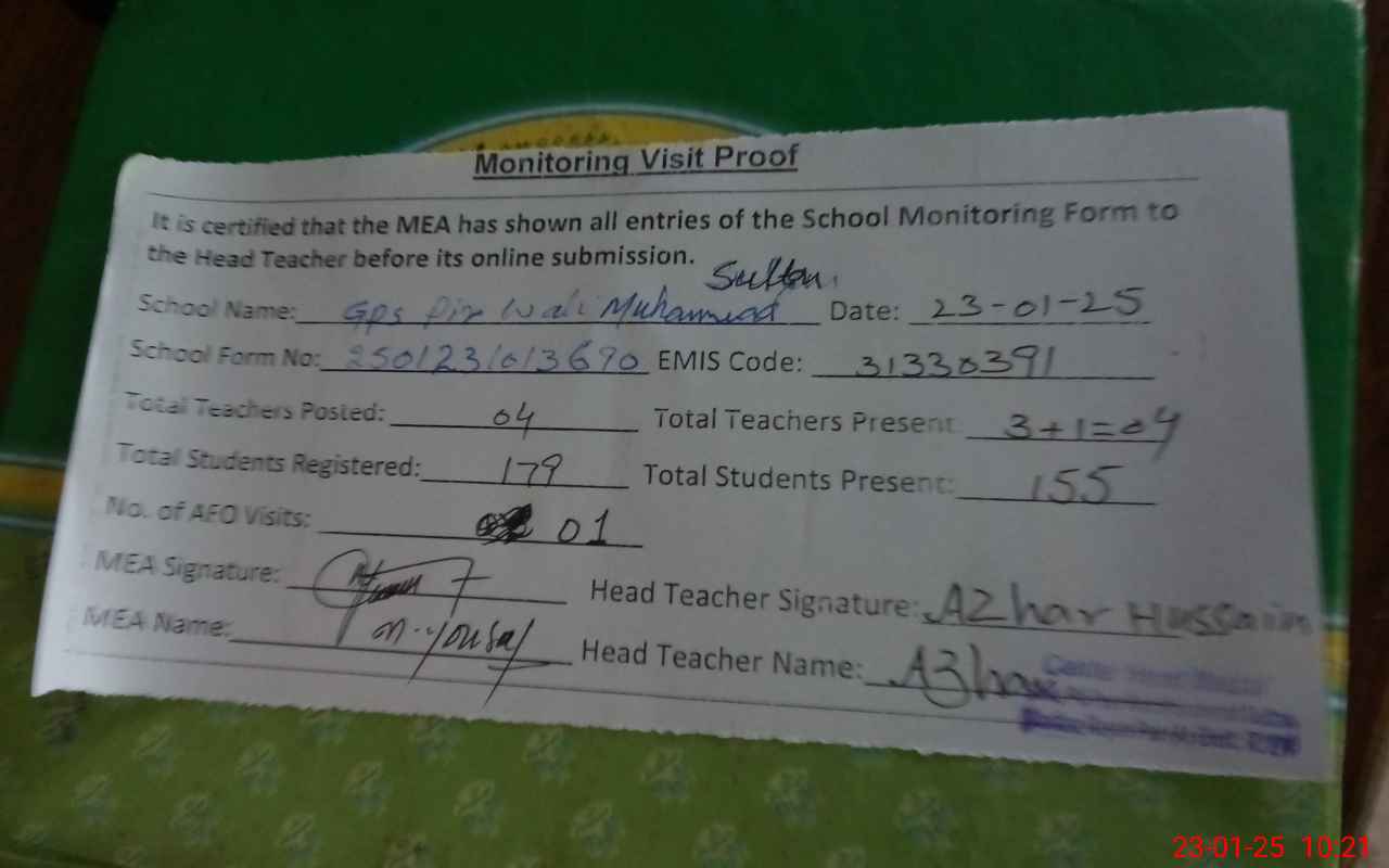 | EMIS Code: 31330391 | Name of School: GPS PIR WALI MUHAMMAD SULTAN | |||