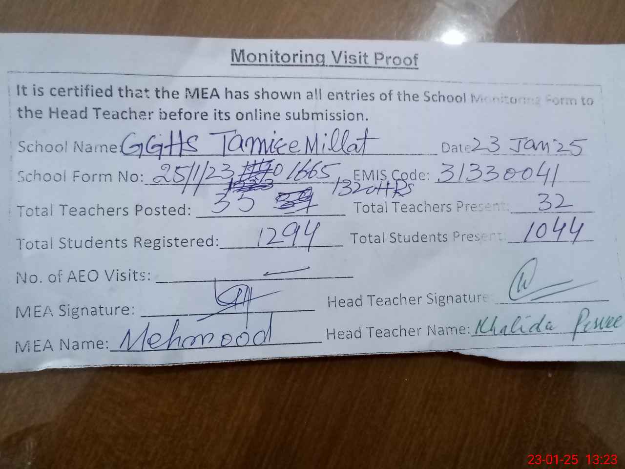 | Attendance Register | Head Teacher | MEA with School | Visit Proof |