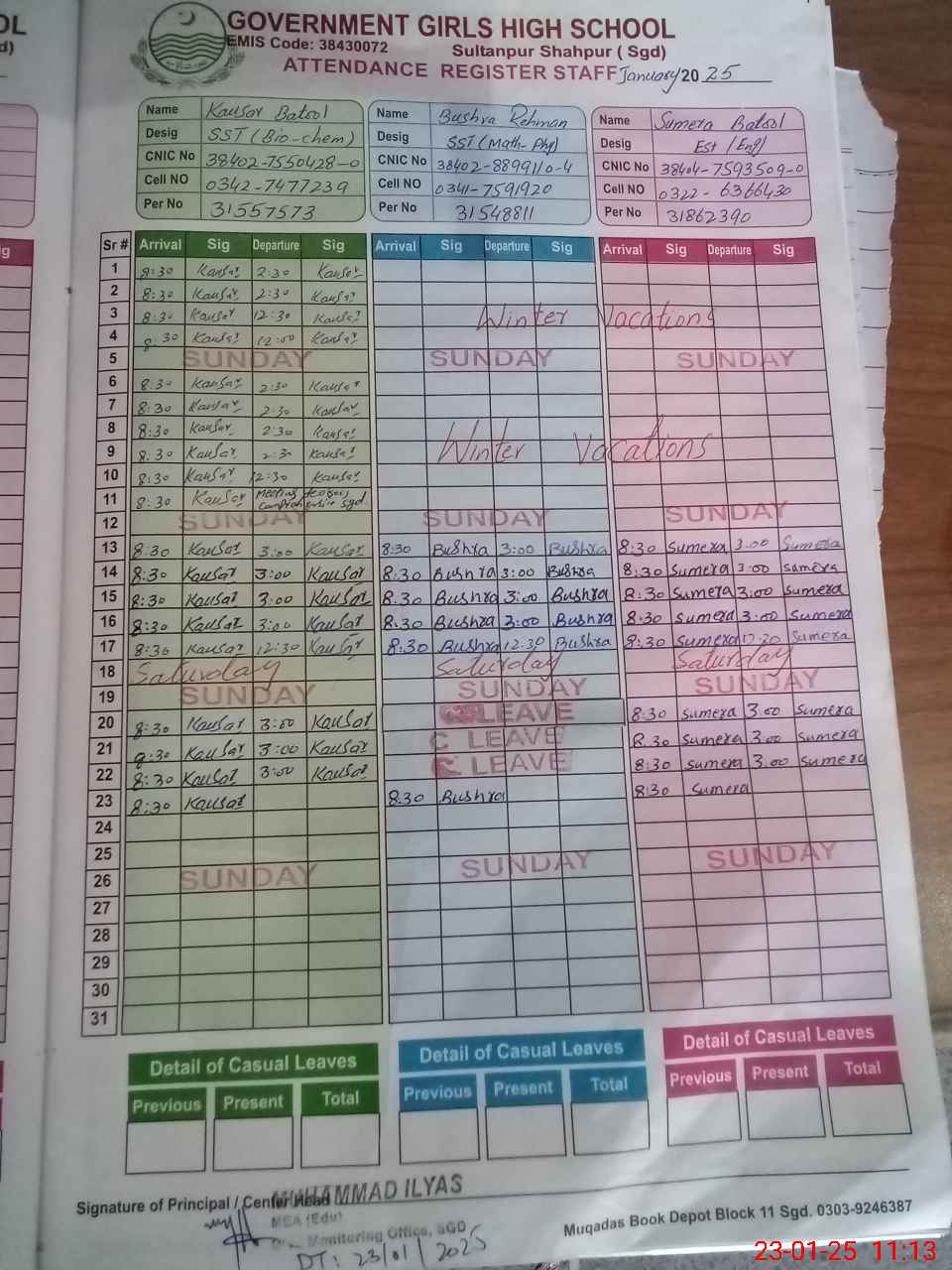 | CNIC | Full Name | Designation | R/C | Absence During Last Calender Month |