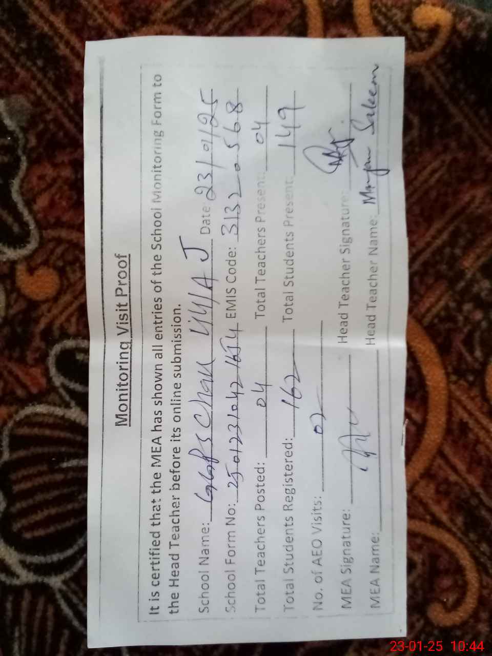 | Attendance Register | Head Teacher | MEA with School | Visit Proof |