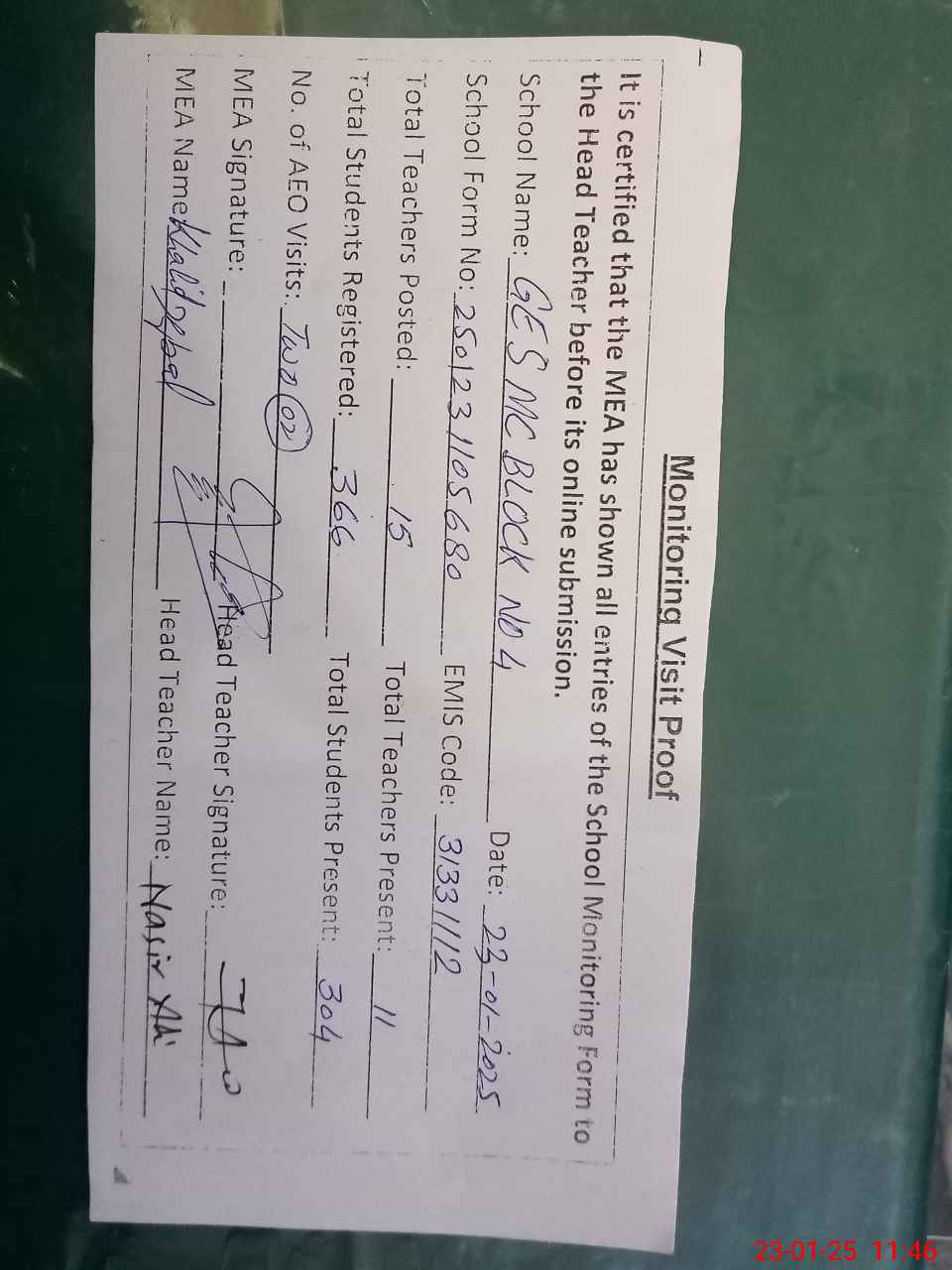 | Attendance Register | Head Teacher | MEA with School | Visit Proof |