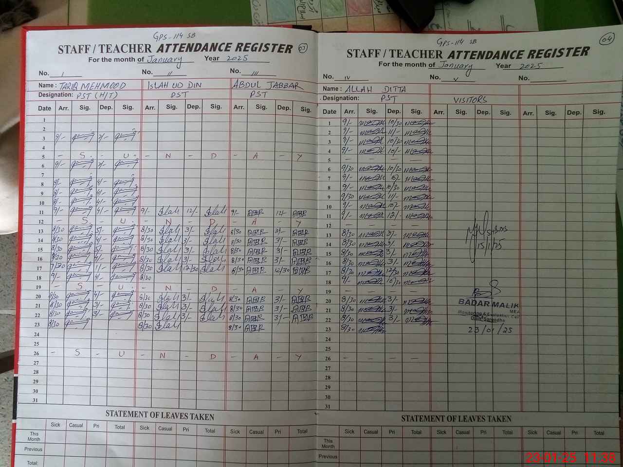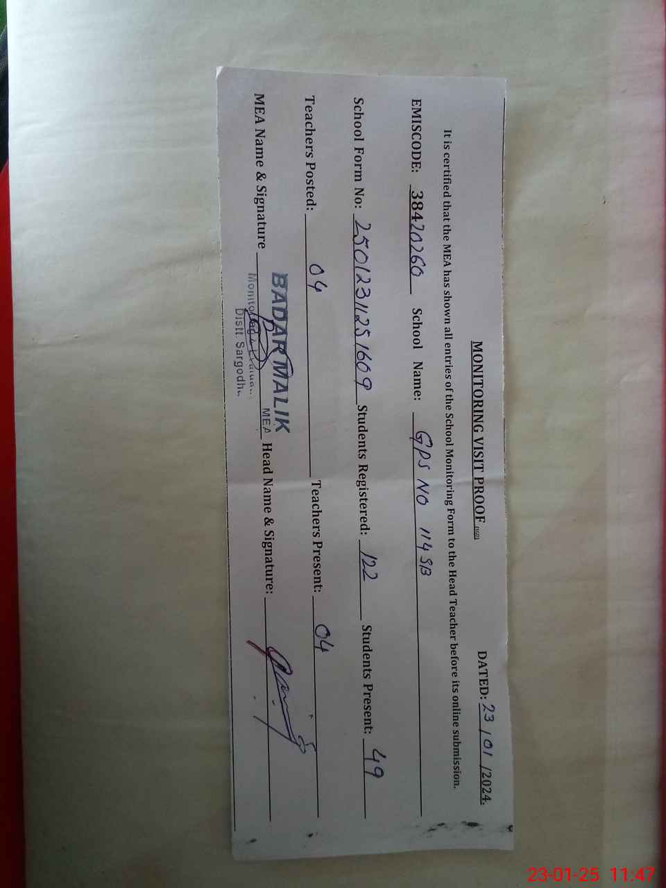 | Attendance Register | Head Teacher | MEA with School | Visit Proof |
