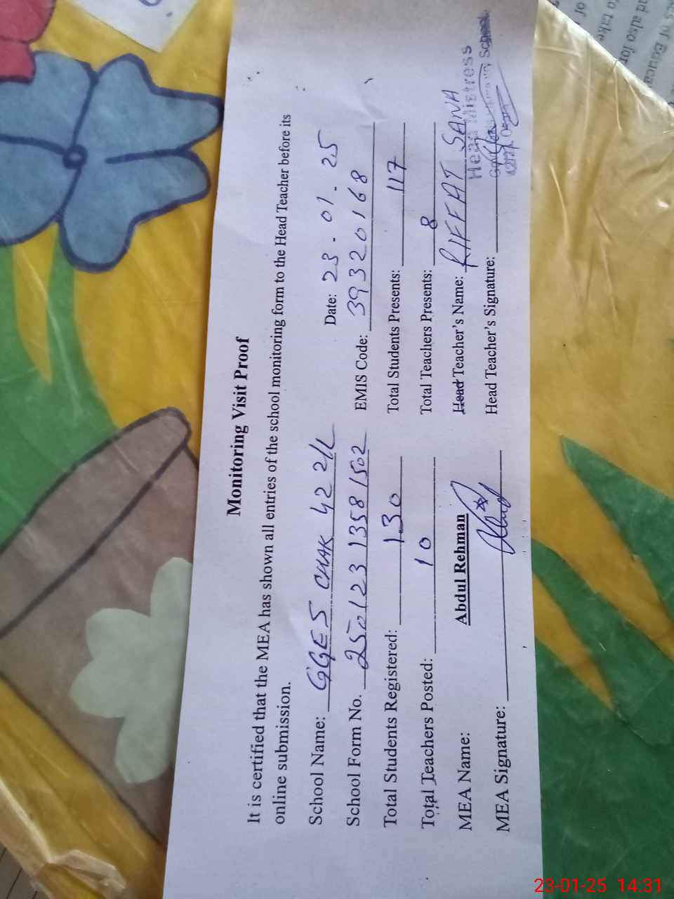 | Attendance Register | Head Teacher | MEA with School | Visit Proof |