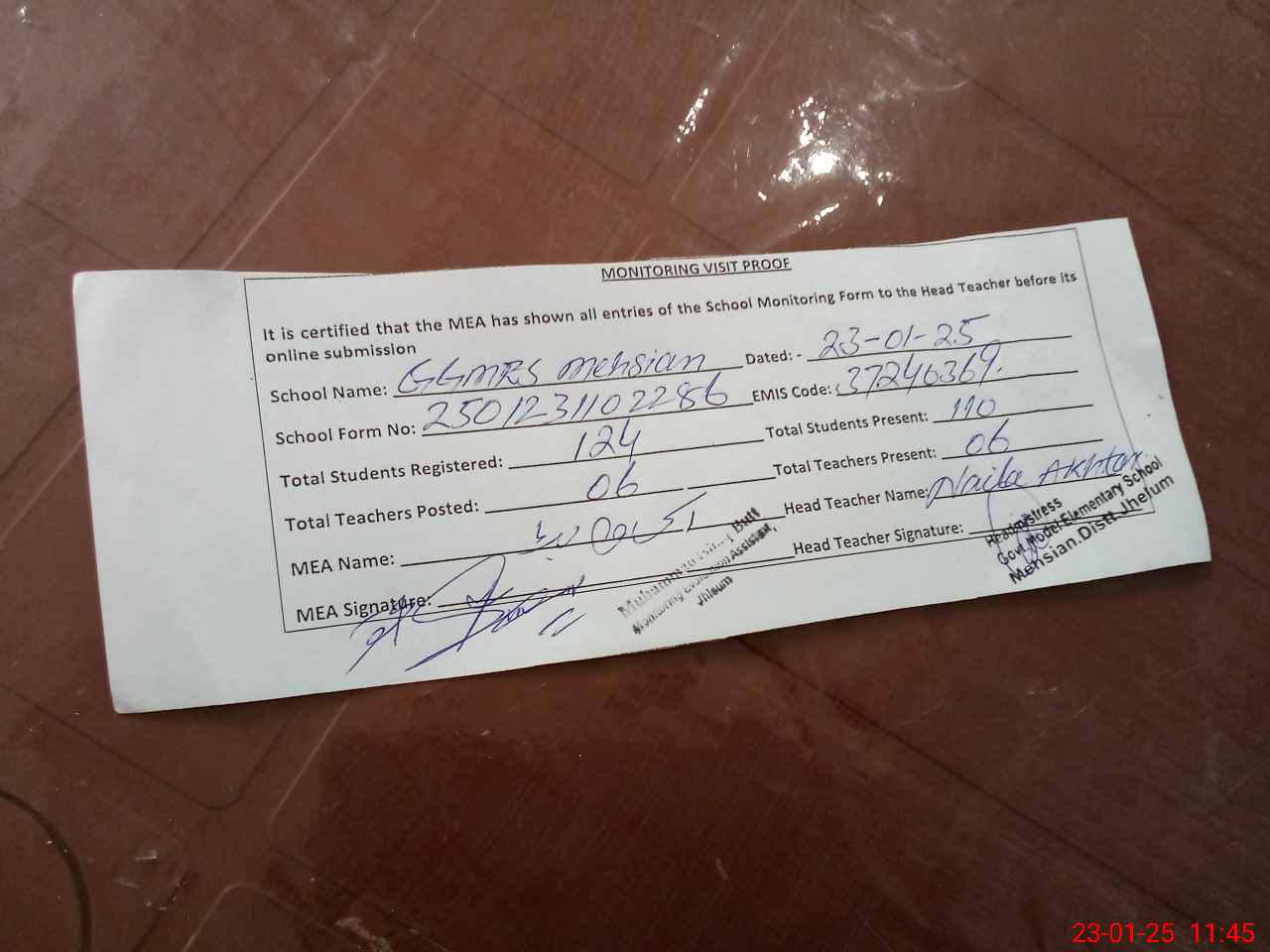 | Attendance Register | Head Teacher | MEA with School | Visit Proof |