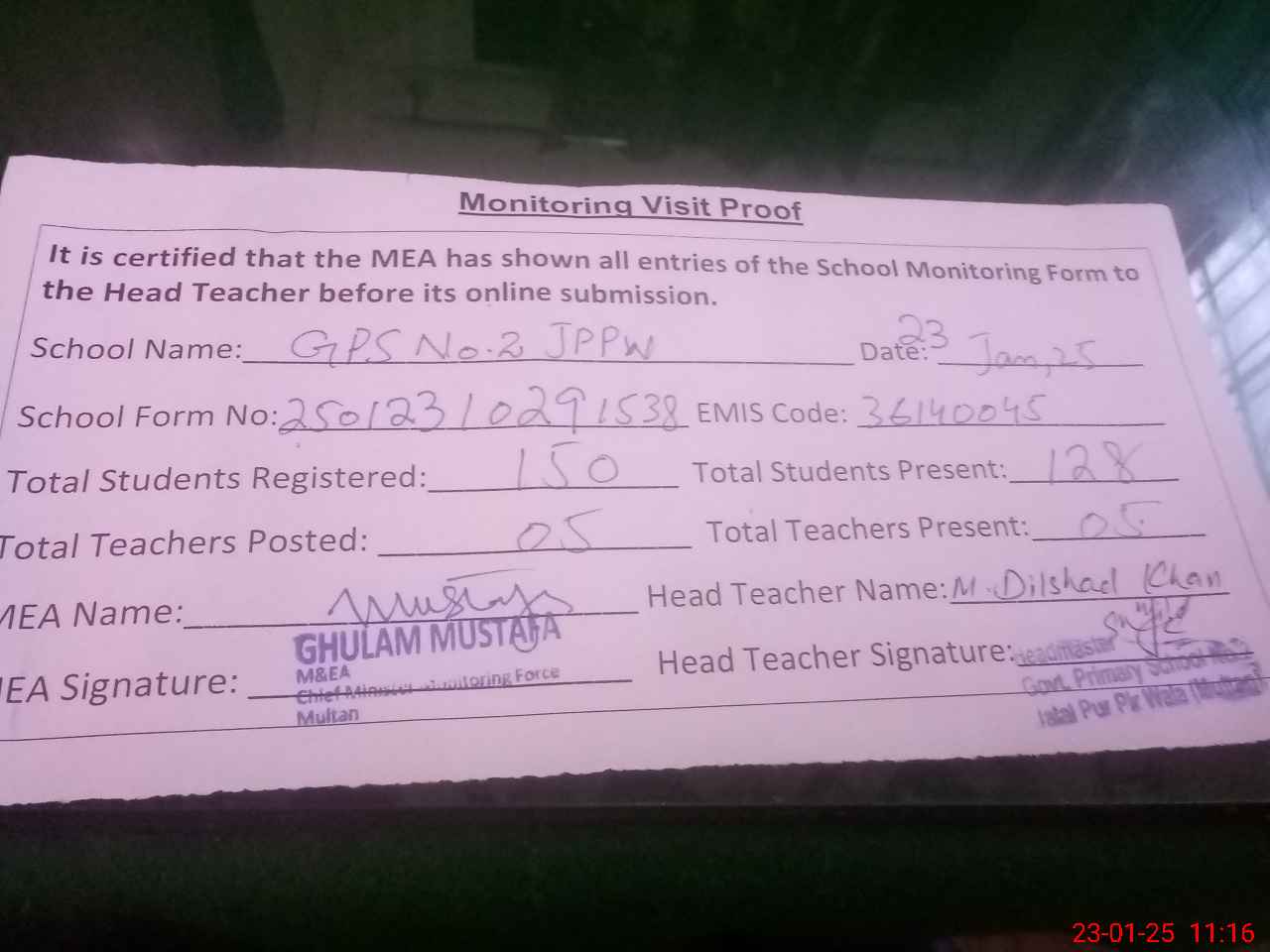 | Attendance Register | Head Teacher | MEA with School | Visit Proof |