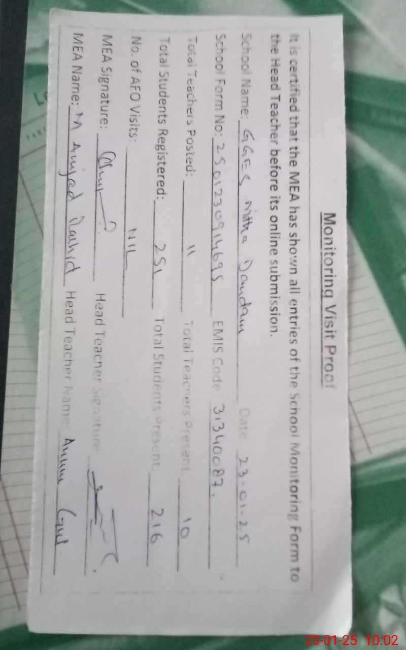 | Certified that this School was Inspected by the Undersigned MEA/DMO Today and the Information Stated Above is as Per Record. | |||||