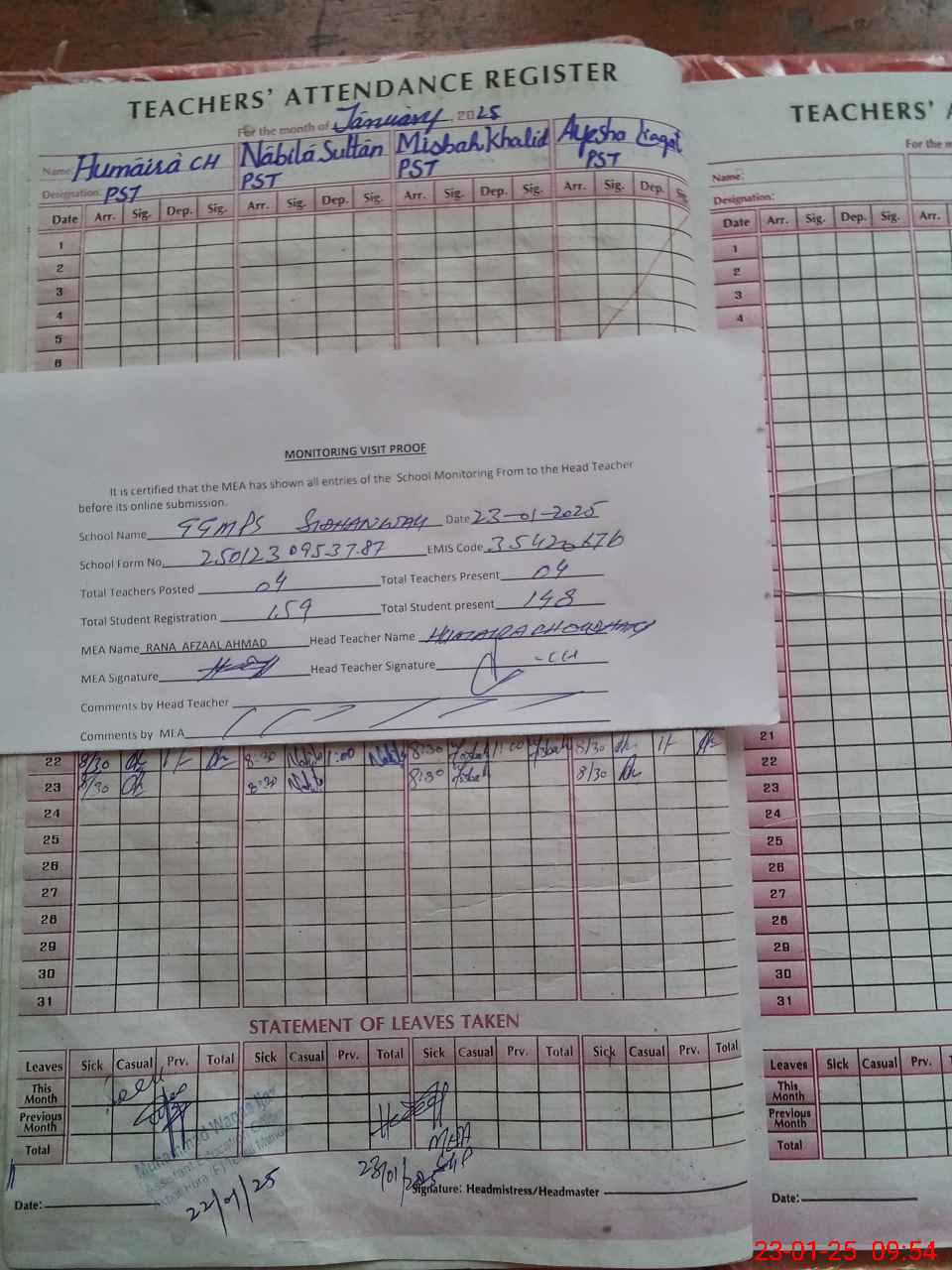 | Attendance Register | Head Teacher | MEA with School | Visit Proof |