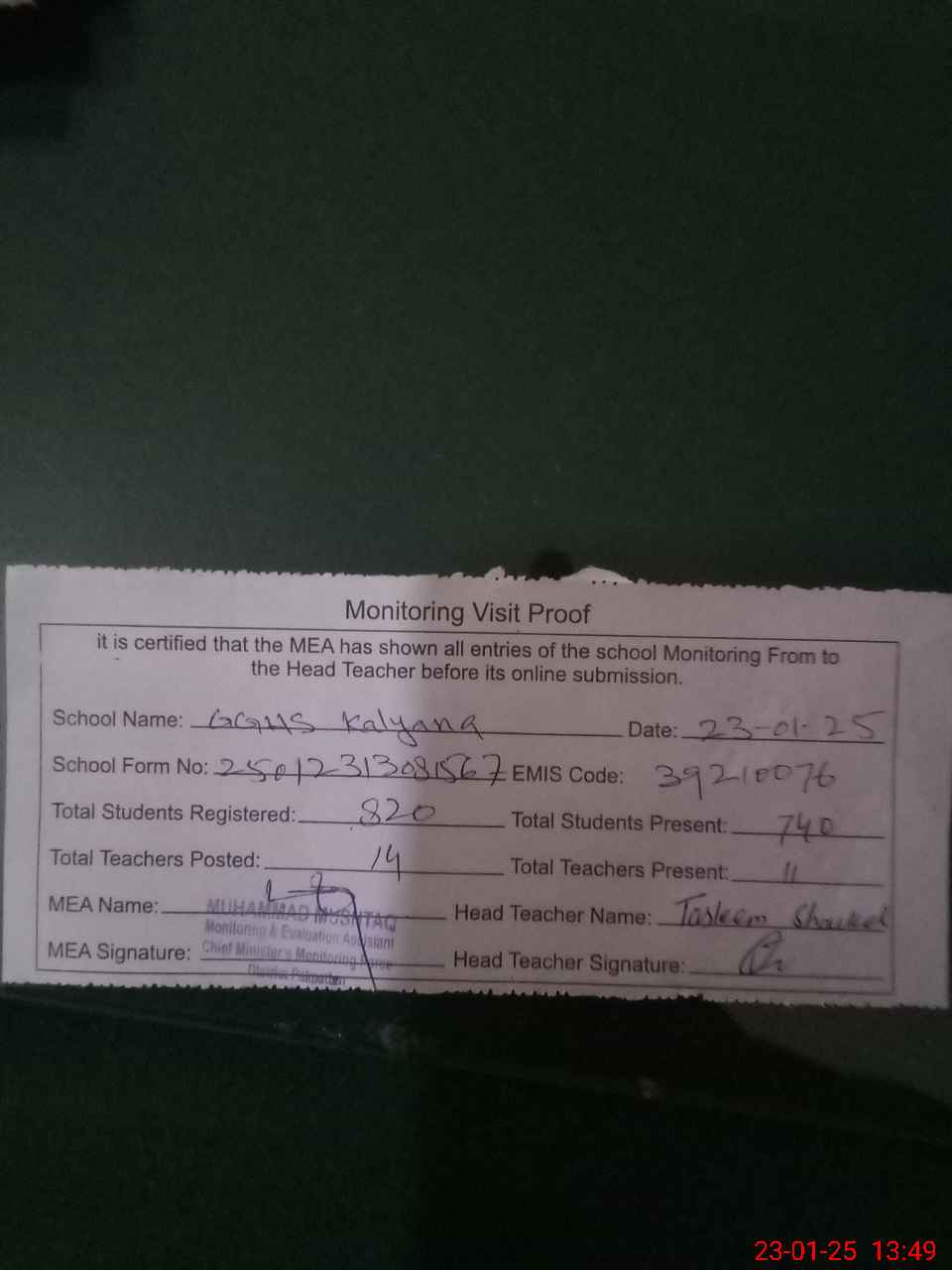 | Attendance Register | Head Teacher | MEA with School | Visit Proof |