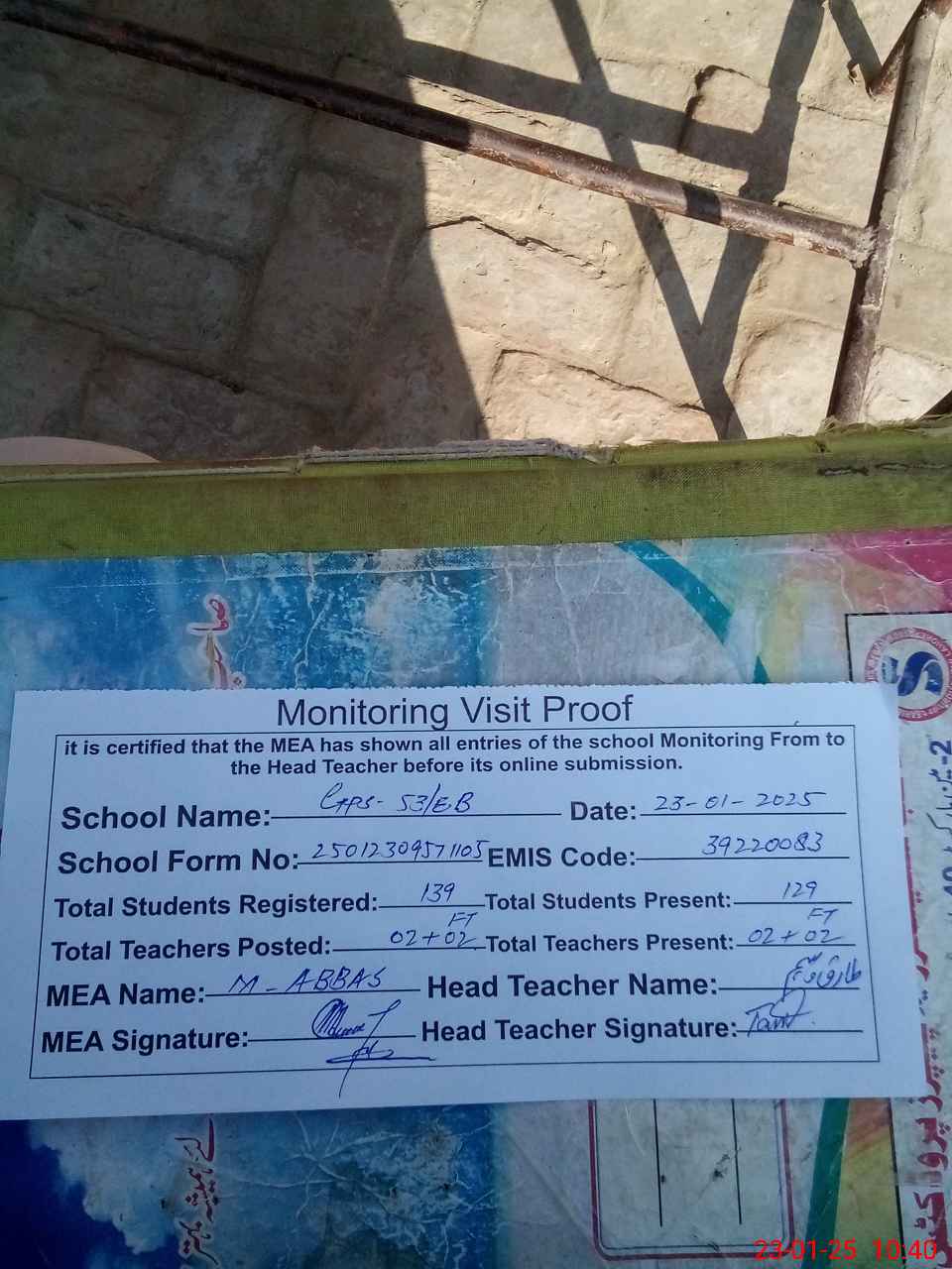 | Attendance Register | Head Teacher | MEA with School | Visit Proof |