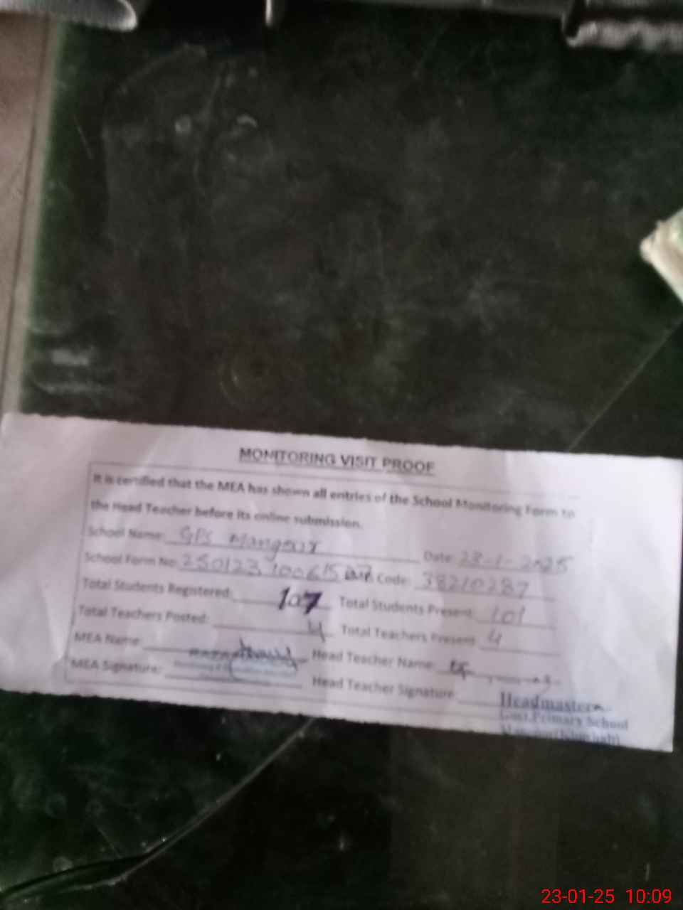 | Attendance Register | Head Teacher | MEA with School | Visit Proof |