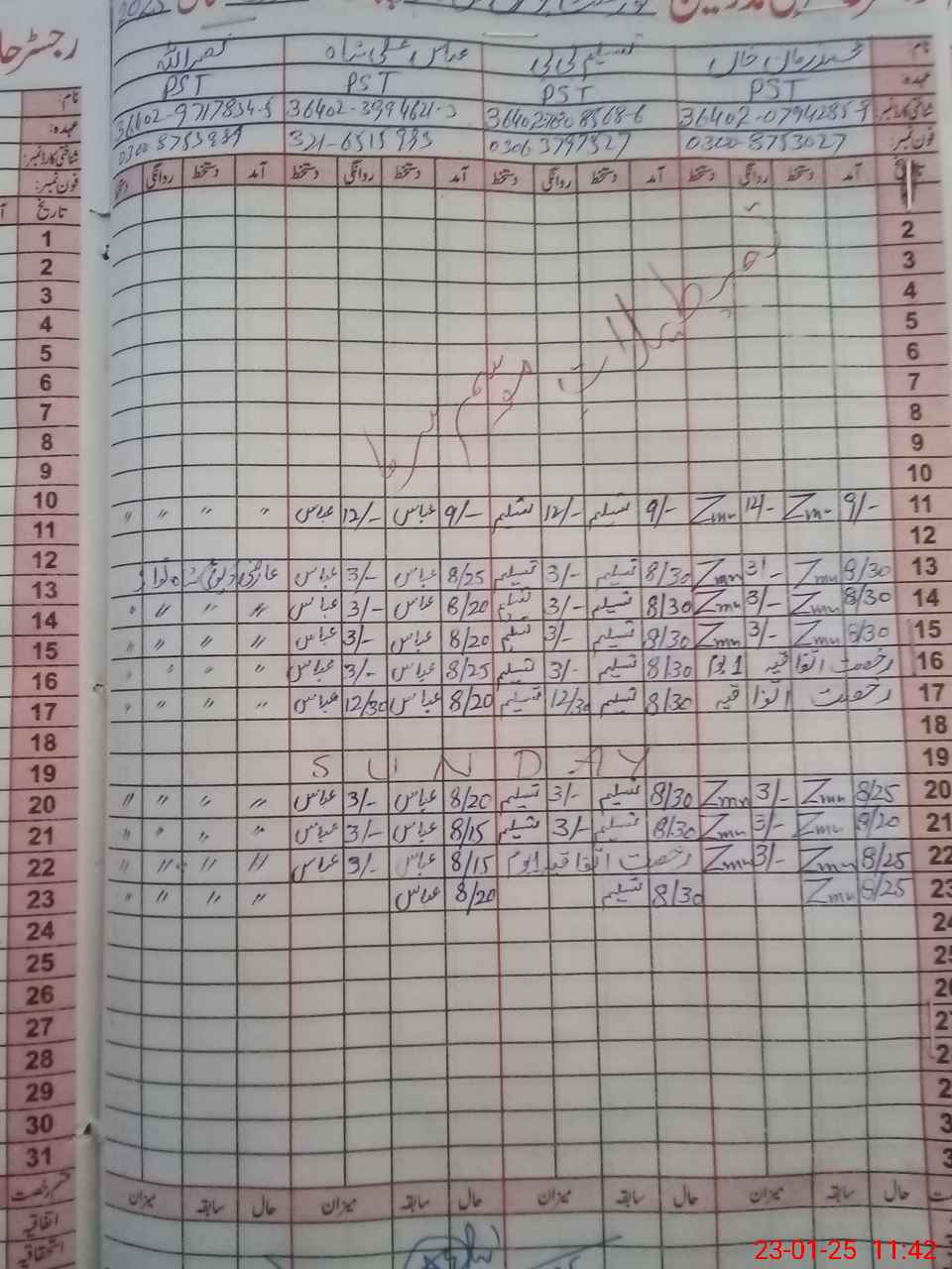 | CNIC | Full Name | Designation | R/C | Absence During Last Calender Month |
