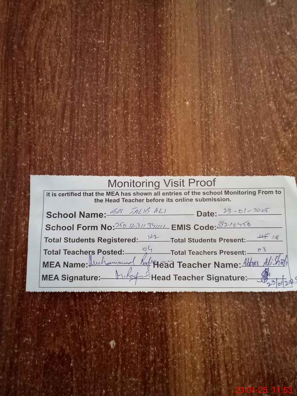 | Attendance Register | Head Teacher | MEA with School | Visit Proof |