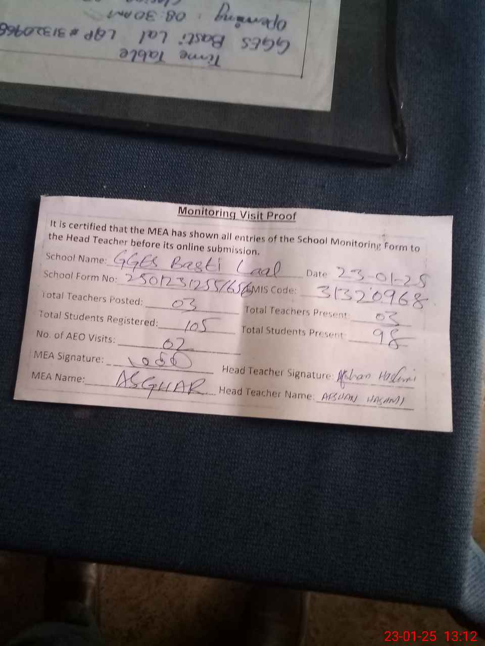 | Attendance Register | Head Teacher | MEA with School | Visit Proof |