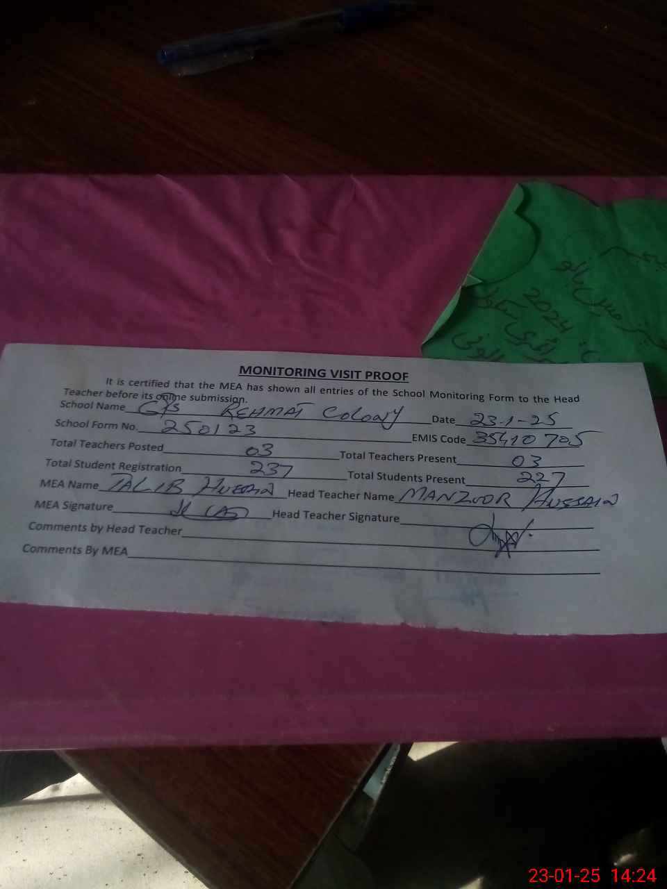 | Attendance Register | Head Teacher | MEA with School | Visit Proof |