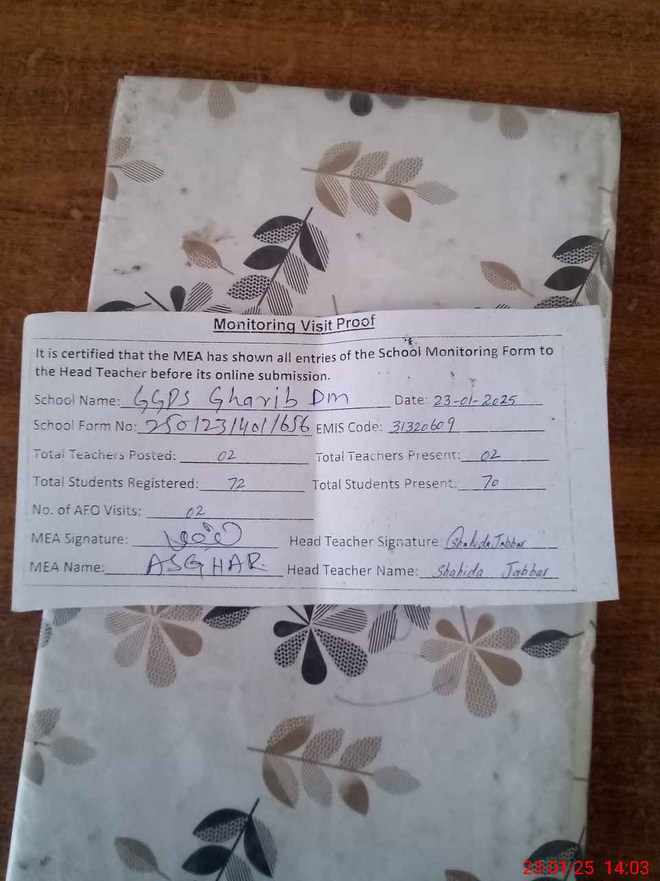 | EMIS Code: 31320609 | Name of School: GGPS GHARIB DIN | |||