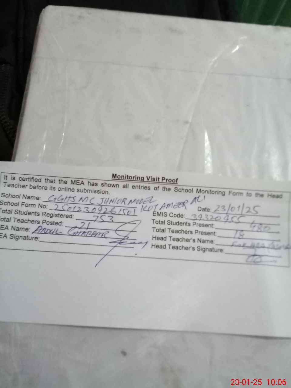| Attendance Register | Head Teacher | MEA with School | Visit Proof |