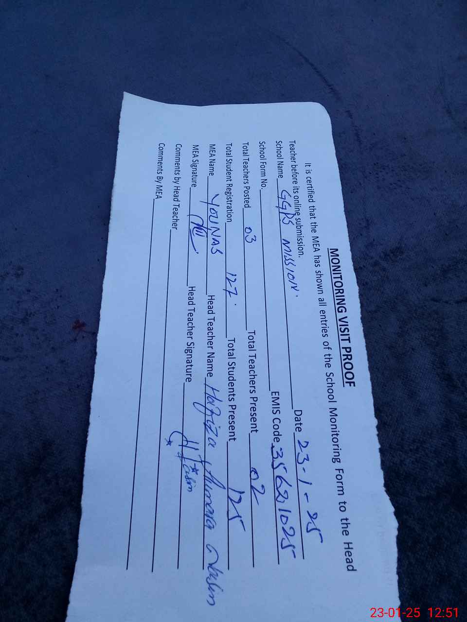 | Attendance Register | Head Teacher | MEA with School | Visit Proof |