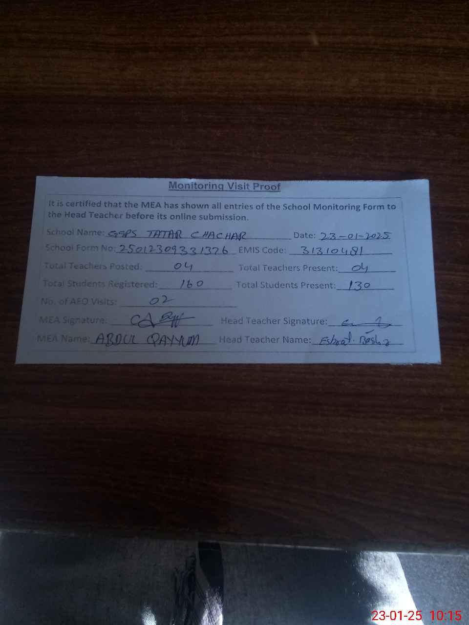 | Attendance Register | Head Teacher | MEA with School | Visit Proof |